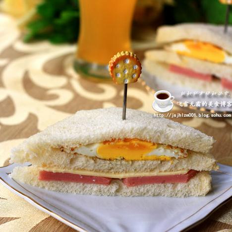 (2)三片面包分两层,第一层放鸡蛋,西红柿片,喜欢的话可以抹上些沙拉酱,第二层放土豆泥和火腿片,如果不喜欢土豆泥的话可以加一些黄瓜片.