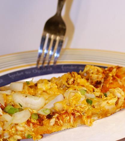 电饭锅底刷一层薄油,将饧好的面擀成1cm厚的薄饼放入,用叉子扎一些小孔。在面饼上均匀地涂沫一层香蒜辣酱,撒少许奶酪丝,再依次撒上甜玉米、豌豆、洋葱碎、青椒丁、红椒丁和黑胡椒最后再均匀地摆上一层奶酪丝。