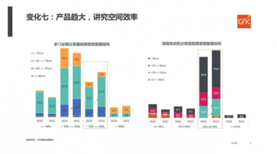 居家生活模式让消费者对家电的容量需求普遍增大,冰箱、洗衣机都有向更大容量发展的趋势;但与此同时,更大的容量却配置了更小的尺寸,机身更纤薄,占地面积更小。