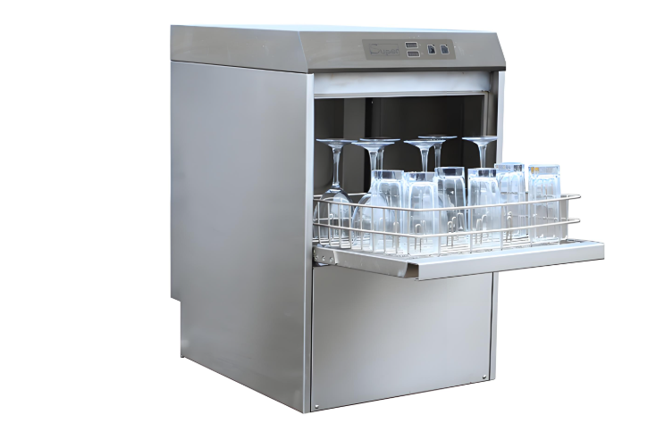 “过去高峰期,三个服务员围着水槽洗杯子,还是跟不上出餐速度。”某网红咖啡馆老板王女士回忆道,“现在一台洗杯机顶五个人,45秒就能完成一筐杯子的清洗,出杯效率直接翻倍!”这种效率的质变,源于台下式洗杯机的核心技术突破。以某品牌为例,其搭载的7.5kg高压水泵与360°旋转喷淋臂,能形成密集水网,彻底瓦解咖啡渍、酒渍等顽固污垢。更值得称道的是,设备内置多档清洗模式,从45秒急速洗到120秒深度洗,可根据杯具类型与脏污程度灵活切换,真正实现“一机多用”。
